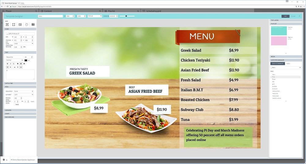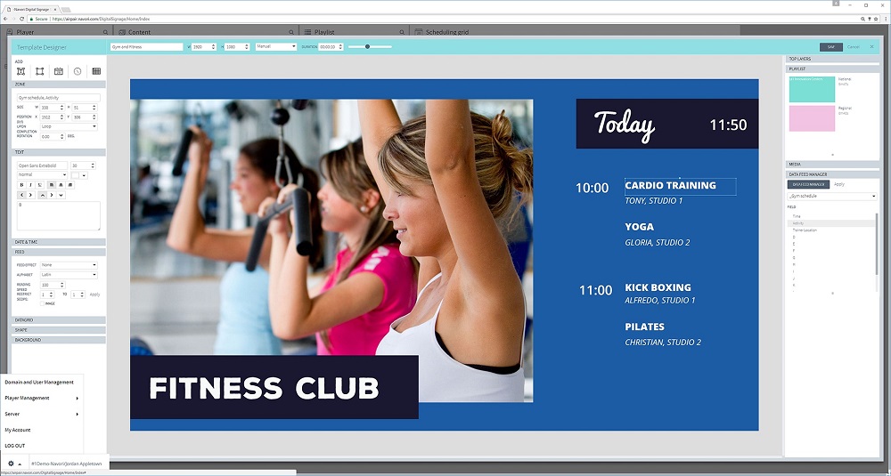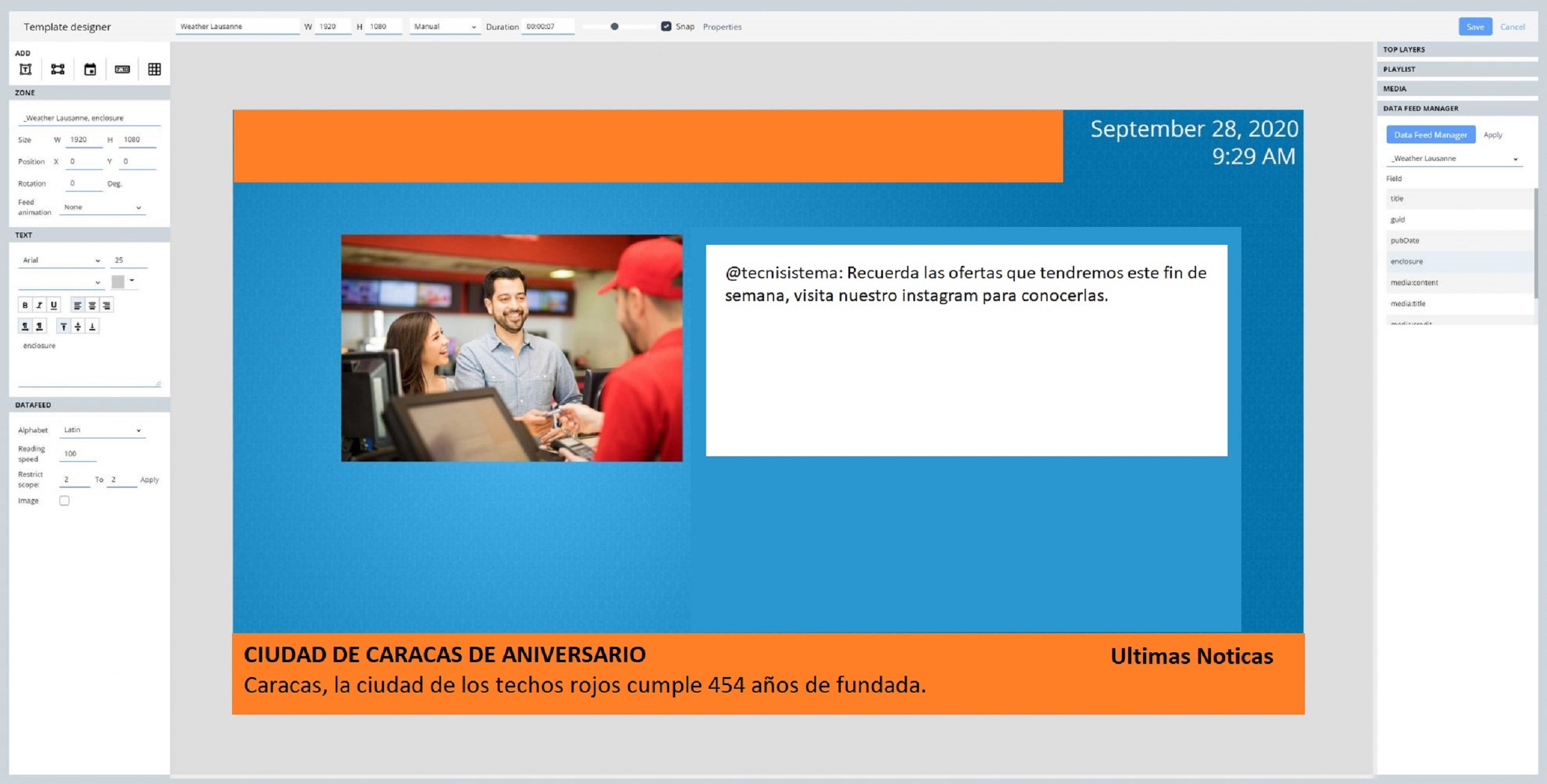 Ejecución de la instalación y configuración de un sistema para videocarteleras las cuales se pueden diseñar al gusto del cliente, además posee funcionalidad para hacer Streaming con una televisión o con cámara, extracción de datos de Redes sociales como Twitter y RSS (Noticias Informativas)